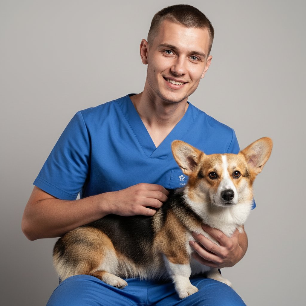 Ветеринар в синей униформе сидит, держа на коленях корги. Он нежно гладит собаку и улыбается в камеру. Съемка крупным планом на светлом нейтральном фоне.