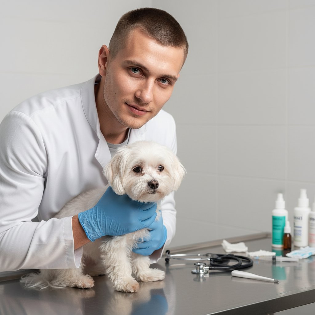 Ветеринар в белом халате и синих перчатках держит на руках маленькую собаку, проводя осмотр у стола. Врач смотрит в камеру с уверенностью и дружелюбием. Крупный план, акцент на профессионализме.