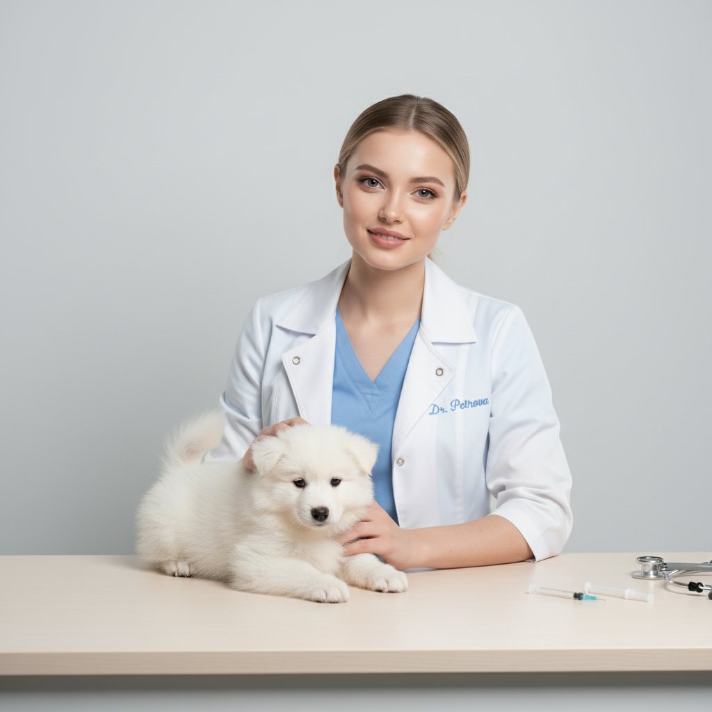 Ветеринарный врач в униформе сидит за столом, на котором лежит пушистый белый щенок. Врач нежно гладит малыша и смотрит прямо в объектив. Фон — светлая, минималистичная студия. Снято крупным планом.