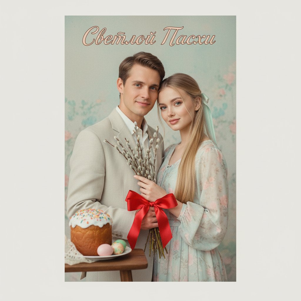 Винтажная православная пасхальная открытка, красивая молодая пара держит нежные пушистые ивовые веточки, связанные мягким красным шелковым бантом, девушка в пастельном платье с лентой в волосах, красивый пасхальный хлеб (кулич) с белой глазурью на заднем плане, эстетика мягкой пленочной фотографии, пастельная приглушенная цветовая палитра, романтическая весенняя атмосфера, стиль Pinterest, текст "Светлой Пасхи" очень детальная — ар 3:4