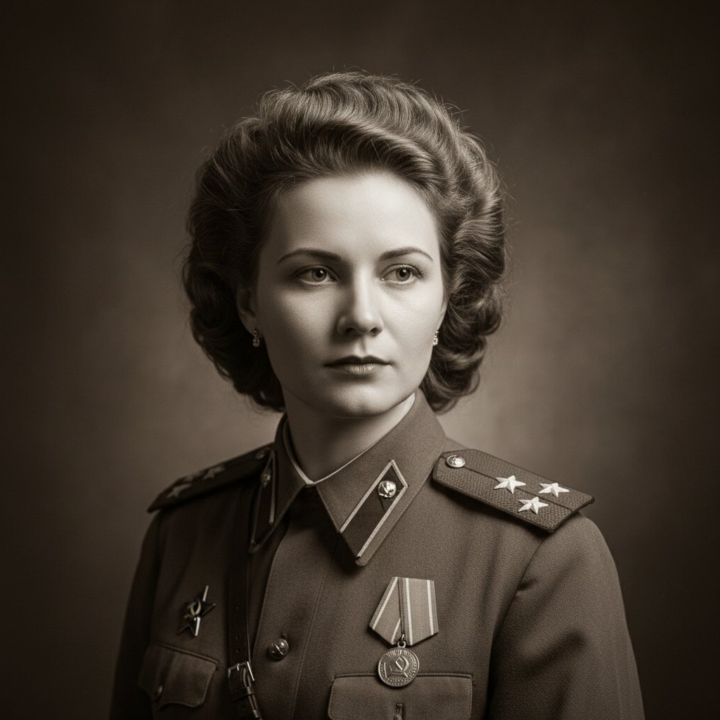 «Используй загруженное фото, сохрани внешность полностью. Винтажный студийный портрет женщины в военной форме советского офицера, причёска в стиле 1940-х с крупными локонами, серьёзный взгляд, тёмный фон, мягкий драматический свет, сепия, классическая фотография эпохи войны, высокая детализация, ретро-эстетика, элегантный исторический стиль».