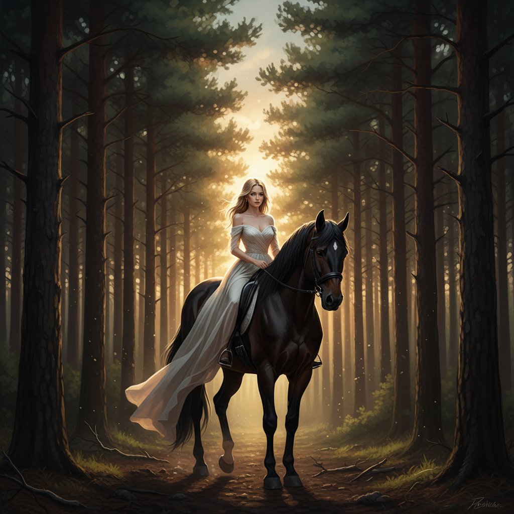 Элегантная женщина в легком платье с открытыми плечами восседает на темной лошади. Густой сосновый лес окружает их, а сквозь верхушки деревьев пробиваются последние лучи заходящего солнца, создавая живописный силуэт.