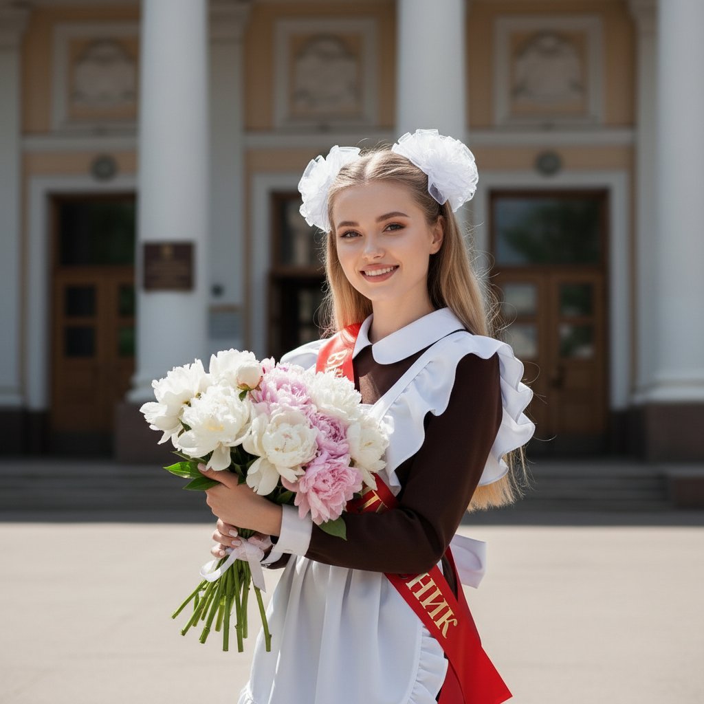 Юная выпускница в школьной форме, украшенной белым фартуком и пышными бантами, позирует с букетом пионов у главного входа в школу. Красная лента 'Выпускник' на груди. Она смотрит в камеру с улыбкой, создавая атмосферу праздника. Снято крупным планом.