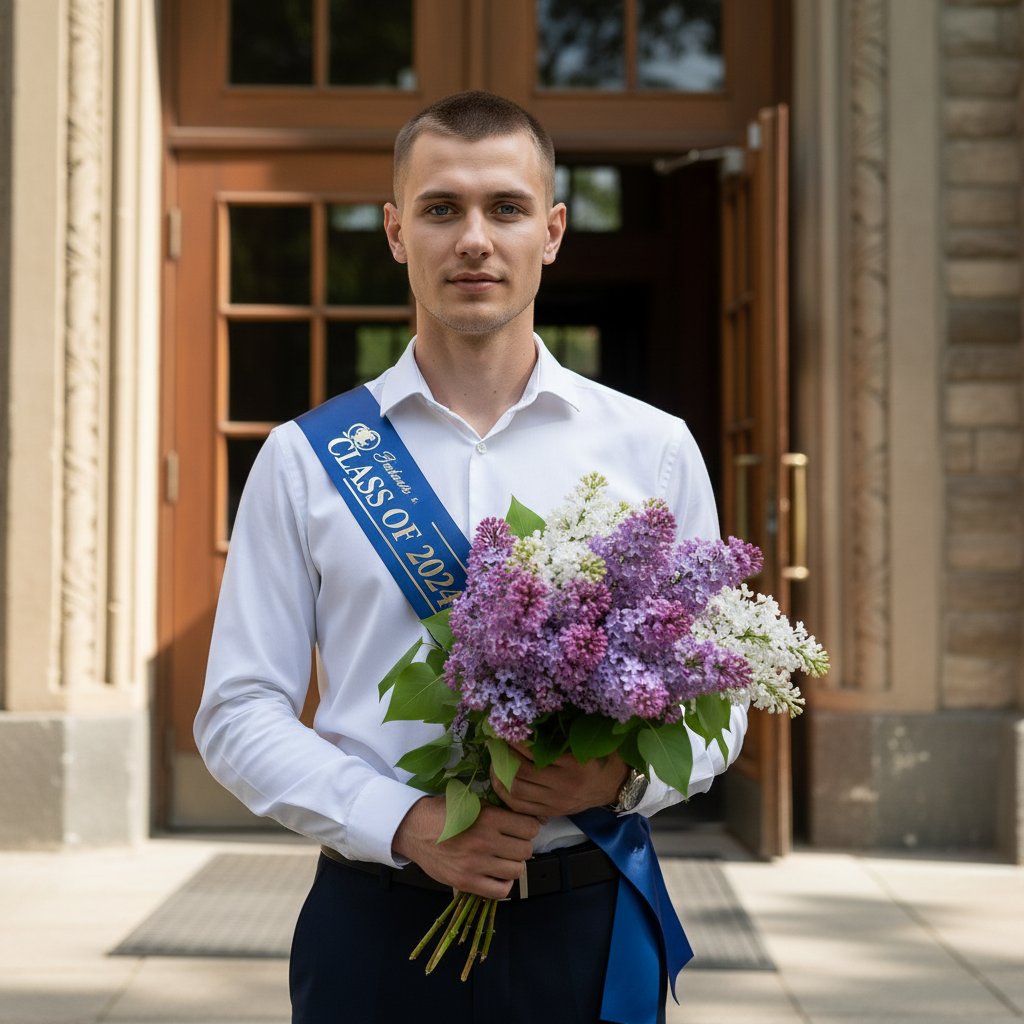 Молодой человек в белой рубашке, темных брюках и ленте выпускника стоит у главного входа в школу. В руках у него букет сирени. Взгляд направлен прямо в объектив, на лице читается гордость и легкое волнение. Крупный план.