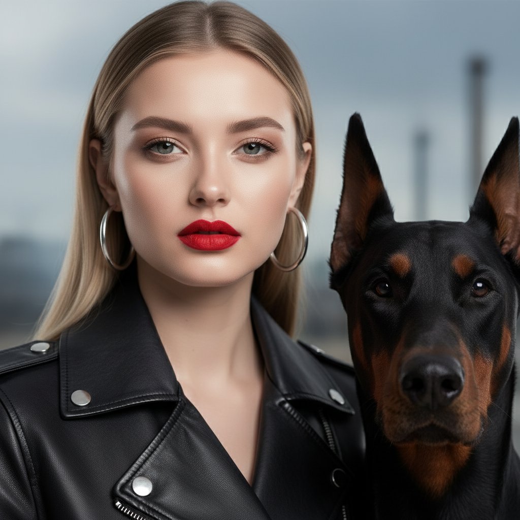 Крупный план лица женщины в черной кожаной куртке и массивных серебряных серьгах. Ее взгляд уверенный, губы ярко-красные. Рядом находится доберман, его морда близко к камере, острые уши подчеркивают дерзкий образ. Контрастное освещение, размытый индустриальный фон.