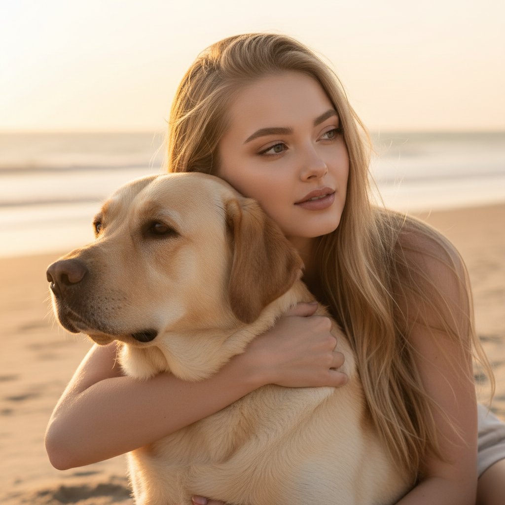 Женщина нежно обнимает своего лабрадора, прислонив щеку к его голове. Их взгляды направлены в разные стороны, но на лицах читается умиротворение. На заднем плане — пляж, легкий бриз развевает ее волосы. Закатное освещение создает теплую, уютную атмосферу.