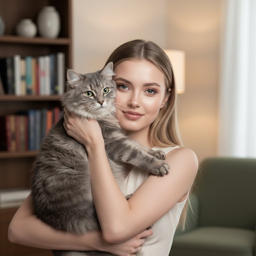 Девушка обнимает пушистого серого кота, прижимая его к своей щеке. Она смотрит в камеру с нежной улыбкой, ласково перебирая его шерсть. На заднем плане — мягкий свет от лампы, стеллажи с книгами и удобное кресло, создающее атмосферу домашнего уюта.