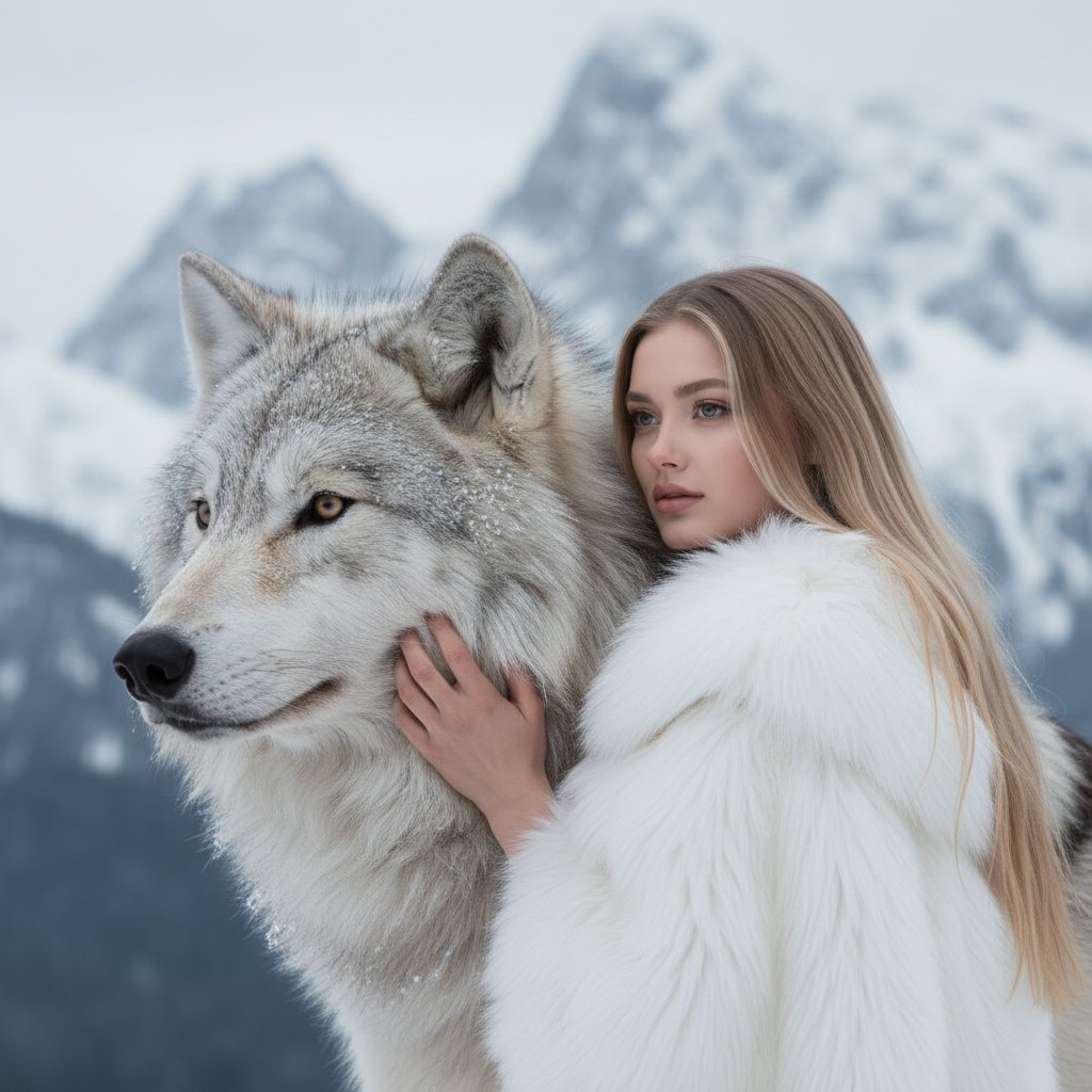 Женщина в меховой накидке и гигантский северный волк стоят вместе, её рука покоится на его загривке. Оба смотрят в одном направлении, её взгляд решителен. На заднем плане видны заснеженные горные пики. Снято крупным планом, подчеркивая их связь.