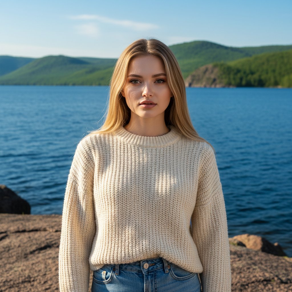Портрет женщины на острове Ольхон, стоящей на каменистом берегу. За ней раскинулось озеро Байкал, окруженное живописными пейзажами в насыщенных синих и зеленых тонах. На ней теплый свитер и джинсы. Яркое солнце освещает сцену, выделяя текстуру скал. Легкий бриз развевает волосы. Крупный план, лицо выражает спокойствие и умиротворение.
