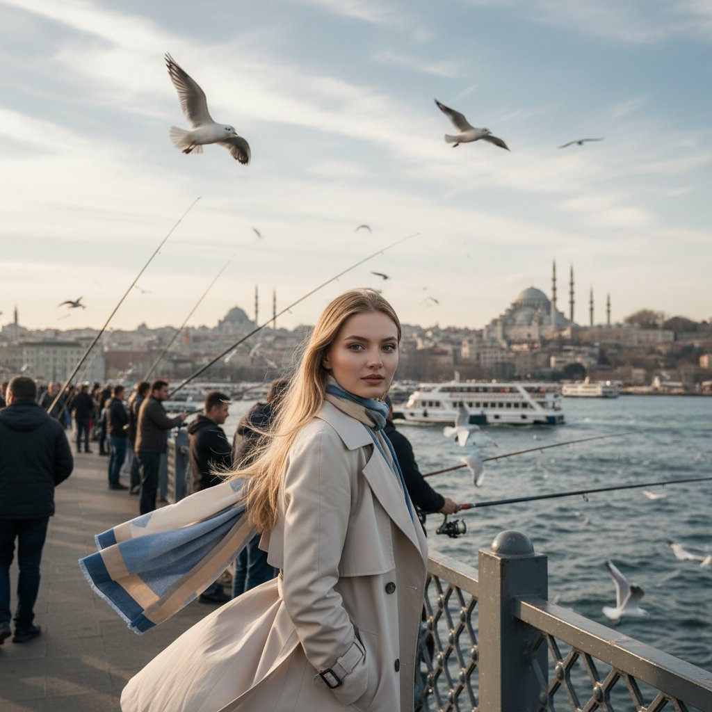 Женщина среднего плана, идущая по Галатскому мосту. На заднем плане видны рыбаки, чайки и пролив Босфор. На ней легкий плащ и развевающийся шарф. Взгляд направлен в объектив. Фокус на динамике момента и атмосфере городской жизни.