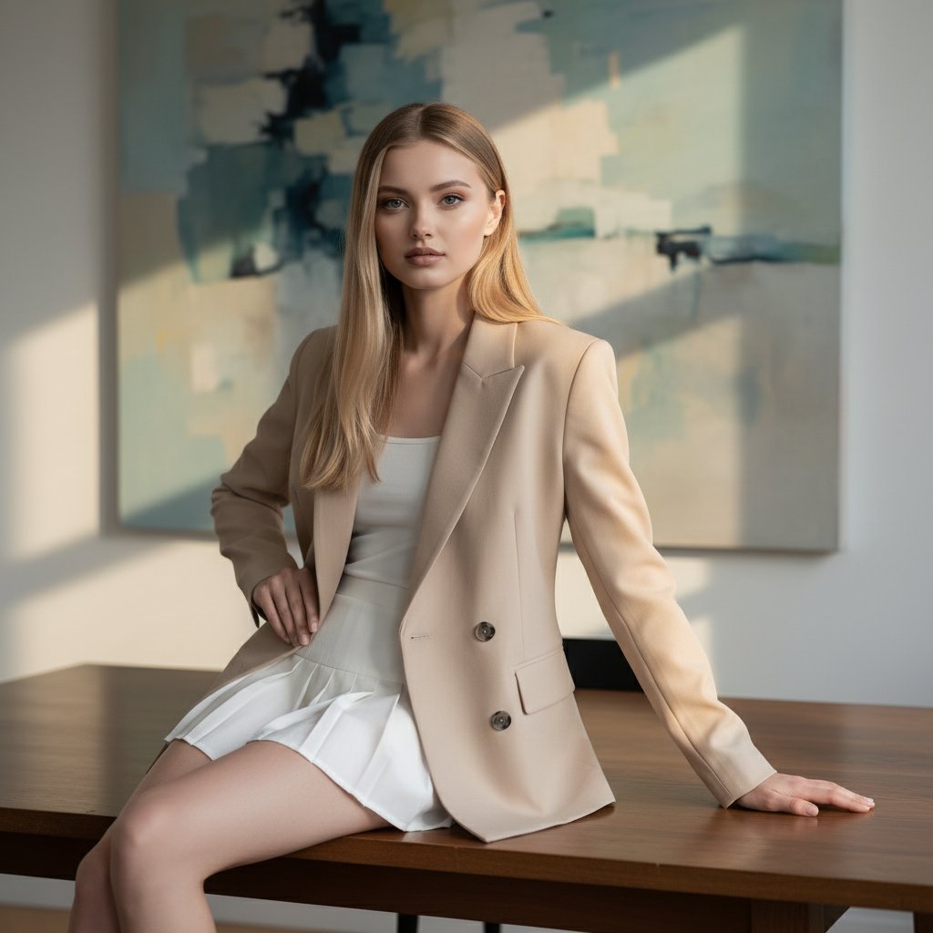 Женский портрет: модель в бежевом двубортном пиджаке и короткой белой юбке располагается на деревянном столе. Одна рука опирается, другая вытянута вдоль столешницы. Задний план украшает абстрактная картина в спокойных тонах, на стене видны теплые солнечные блики.