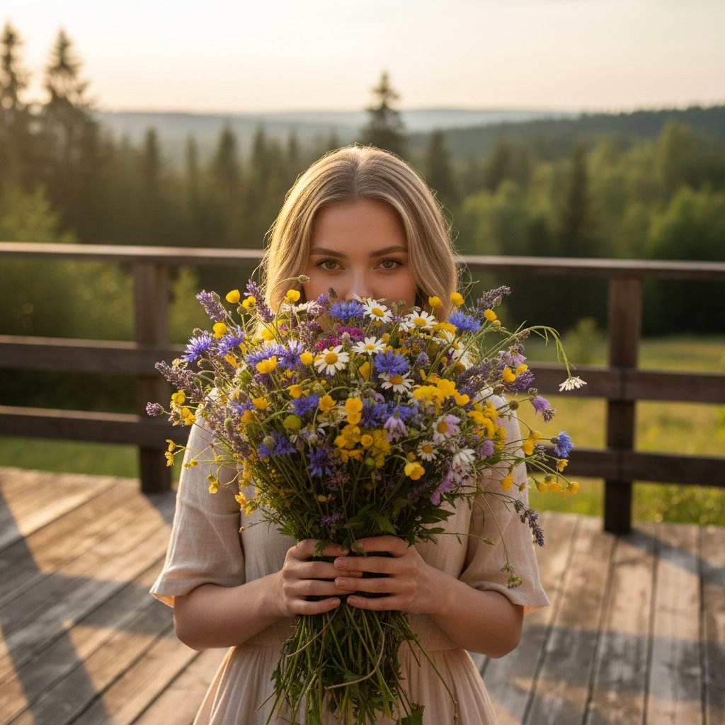 Женщина на террасе, держащая у лица пышный букет свежесобранных полевых цветов. Её взгляд направлен в камеру, выражение лица мечтательное. На заднем плане видны деревянные перила и лесной пейзаж. Мягкий свет заходящего солнца создает теплую атмосферу.
