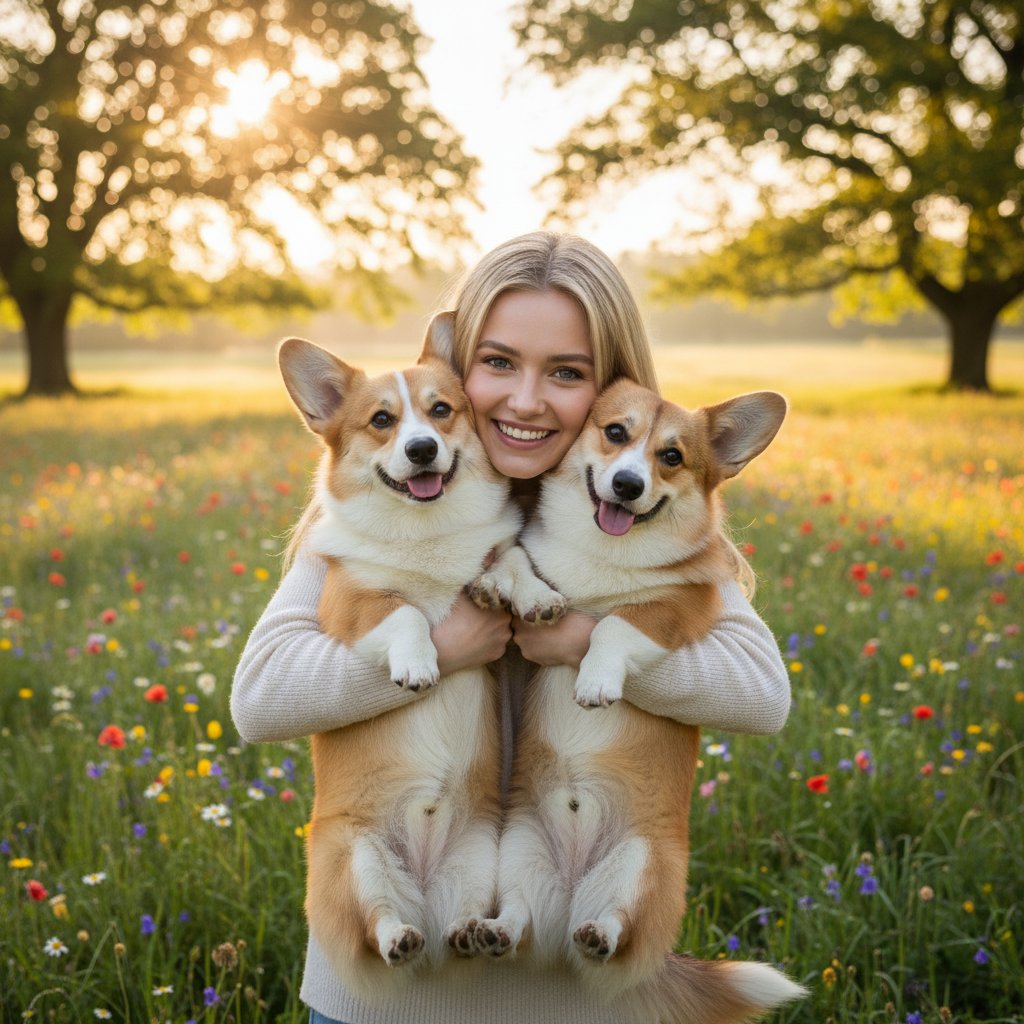 Крупный план: женщина обнимает двух корги, которые радостно смотрят в объектив. На заднем плане — залитая утренним солнцем поляна, усыпанная цветами, с раскидистыми деревьями.