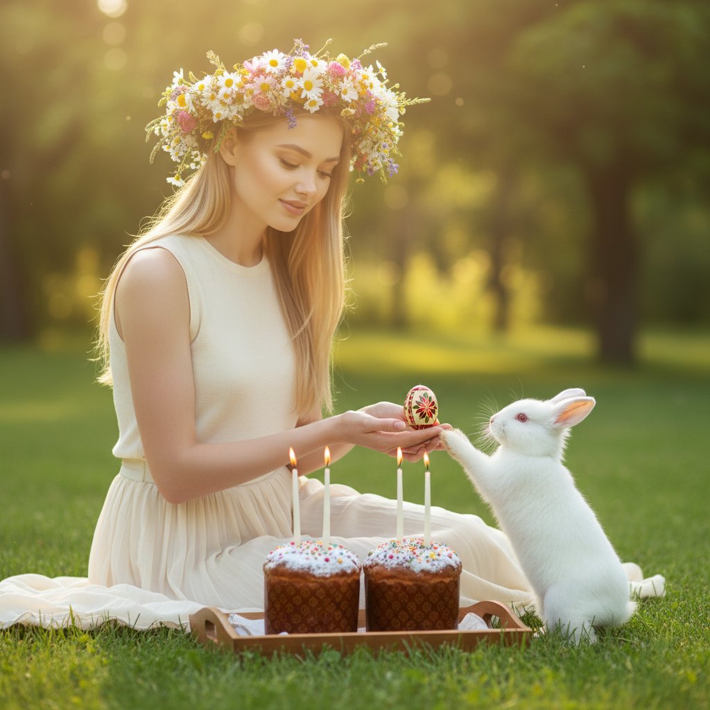 Портрет женщины в летнем наряде с венком из цветов на голове, сидящей на лужайке. Перед ней на деревянном подносе расположены куличи и зажженные свечи. Она нежно держит в руках расписное пасхальное яйцо, а рядом примостился белый кролик, тянущийся к ней. На заднем плане видны деревья, освещенные солнечными лучами. Съемка крупным планом, передающая естественность и светлое настроение праздника.