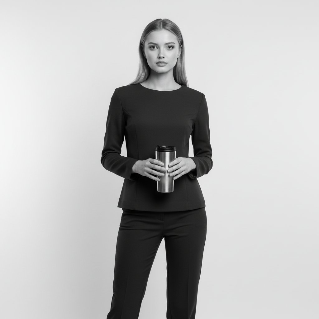 Монохромный снимок молодой женщины в строгом топе и брюках, держащей в руках металлическую кружку. Она стоит на фоне белой циклорамы, взгляд направлен в объектив. Мягкое освещение акцентирует внимание на минималистичном пространстве и естественности позы.