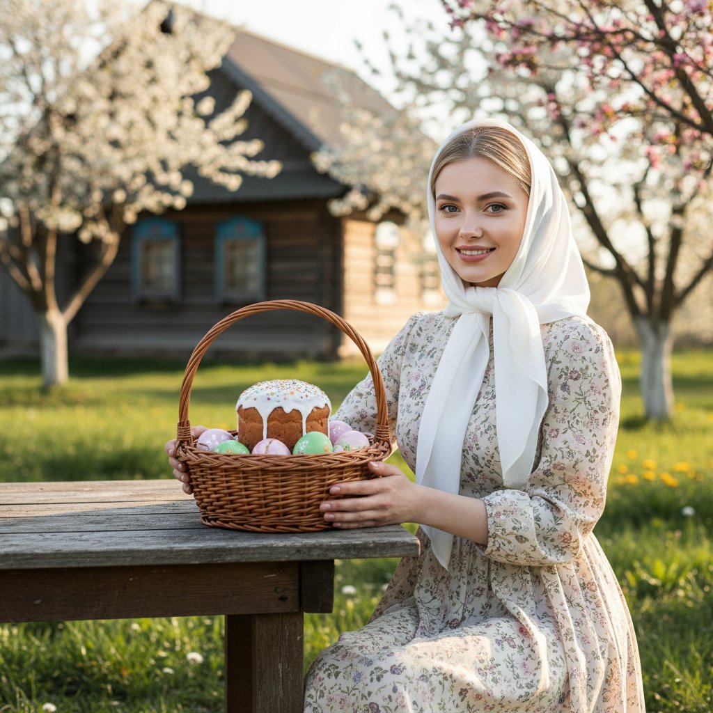 Портрет женщины в светлом платье с цветами и белом платке, сидящей на улице за деревянным столом. В руках она держит корзину с пасхальными яйцами и куличом. Женщина улыбается в камеру. На заднем плане видны деревянная изба и цветущие деревья. Крупный план, передающий теплую атмосферу деревенского праздника.