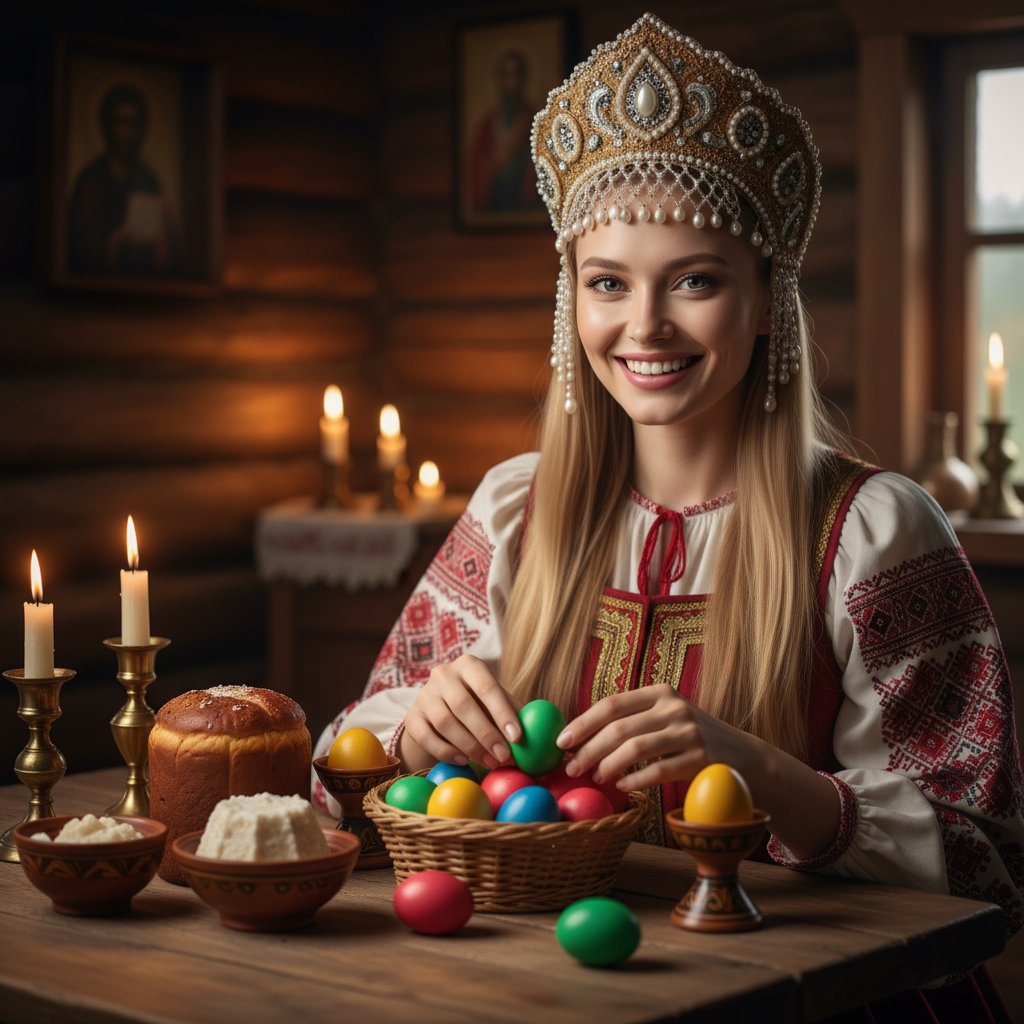 Портрет женщины в праздничном наряде и головном уборе, сидящей за столом и раскладывающей пасхальные яйца. Она смотрит в объектив с широкой улыбкой. На заднем плане — тёплое свечение свечей и интерьер старинного русского дома с деревянными стенами. Снимок крупным планом, передающий атмосферу уюта и семейного праздника.