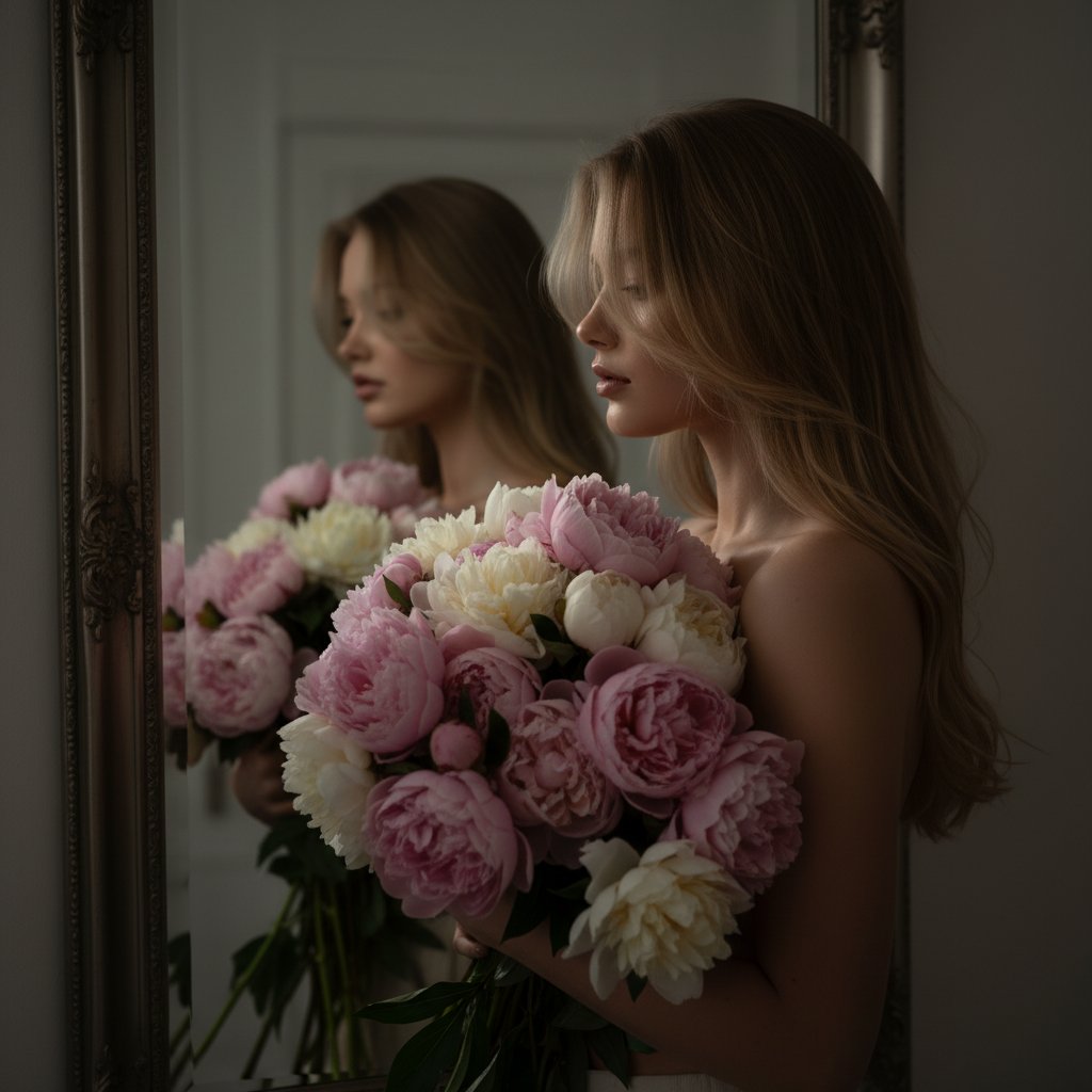 Женский силуэт у зеркала, почти обнаженный, с пышным букетом пионов, который прикрывает тело. Взгляд направлен в отражение, пряди волос спадают на лицо. Крупный план, акцент на романтической и деликатной атмосфере.