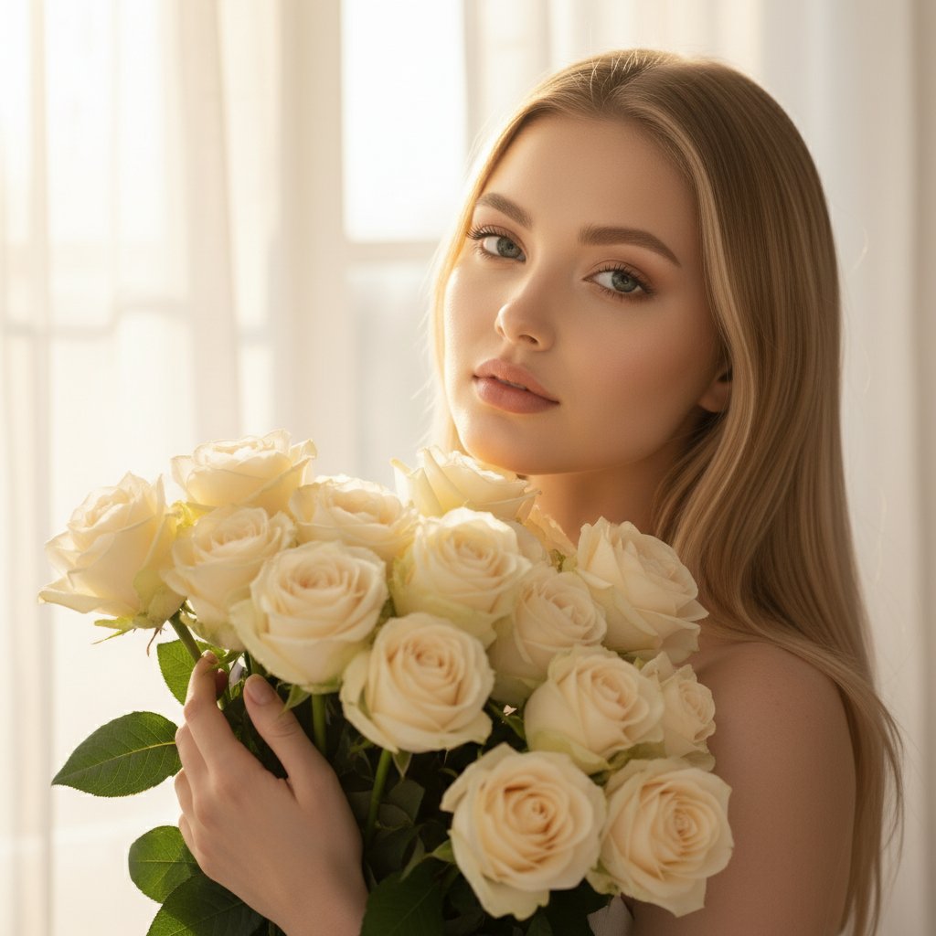 Крупный план портрета женщины, нежно держащей пышный букет кремовых роз. Её пальцы едва прикасаются к бархатистым лепесткам, а голова слегка наклонена. Мягкий солнечный свет пробивается сквозь легкие шторы позади, создавая теплую и уютную атмосферу. Фокус на нежности и свете.