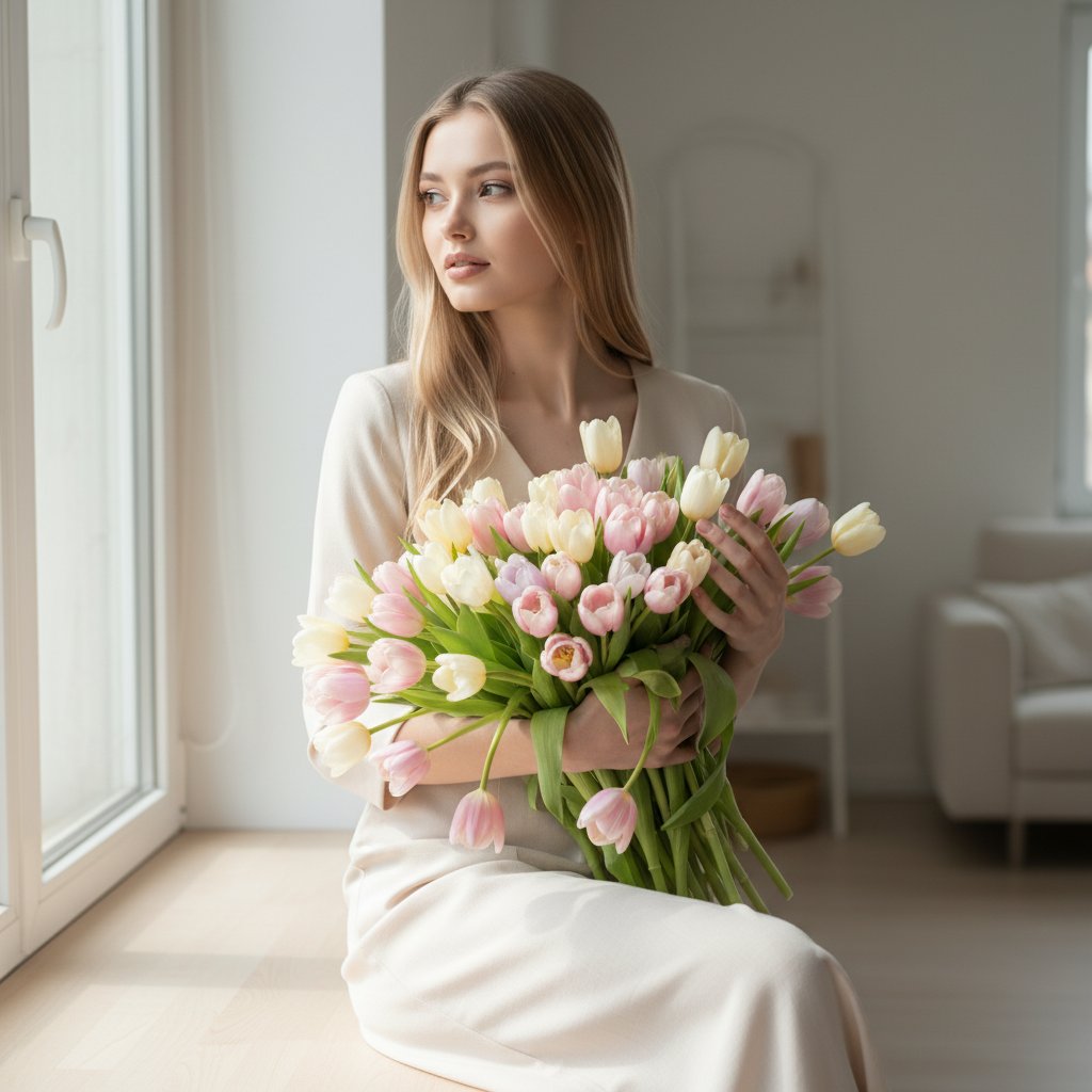Девушка сидит на светлом подоконнике, держа в руках пышный букет тюльпанов нежных оттенков. Её взгляд устремлен в окно, пальцы легко касаются цветов. Утренний свет мягко освещает её лицо, создавая атмосферу умиротворения. За ней — светлый интерьер, добавляющий легкости. Фотография крупным планом, акцентирующая внимание на нежности и спокойствии.