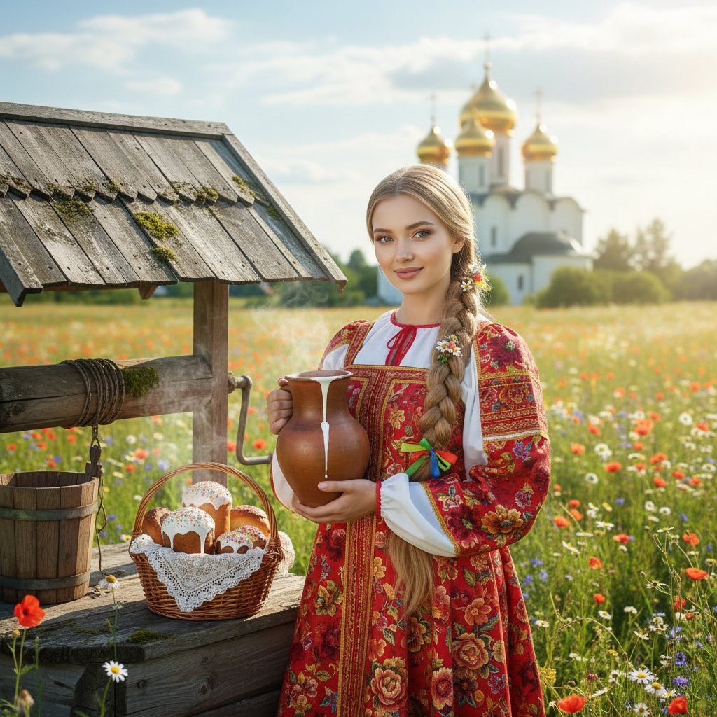 Портрет женщины в традиционном русском сарафане, с длинной косой, стоящей у старинного колодца. В руках она держит глиняный кувшин, наполненный молоком. Рядом с ней стоит плетеная корзина, полная ароматной пасхальной выпечки. Женщина смотрит прямо в объектив, создавая ощущение присутствия. На заднем плане раскинулся живописный луг, усыпанный цветами, и виднеется старинная церковь с сияющими золотыми куполами. Снято крупным планом, чтобы передать атмосферу радостного светлого праздника.