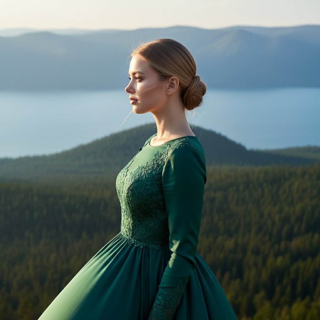 Женский портрет в элегантном платье, волосы собраны. Фигура на фоне природного великолепия Байкальского заповедника. Вид в профиль, лицо залито тёплым солнечным светом. За спиной — изумрудные леса и величественные горы, на горизонте — сверкающая гладь озера Байкал. Ощущение свежести и спокойствия, уверенность в себе. Фокус на лице, передающем умиротворение и единение с природой. Крупный план.