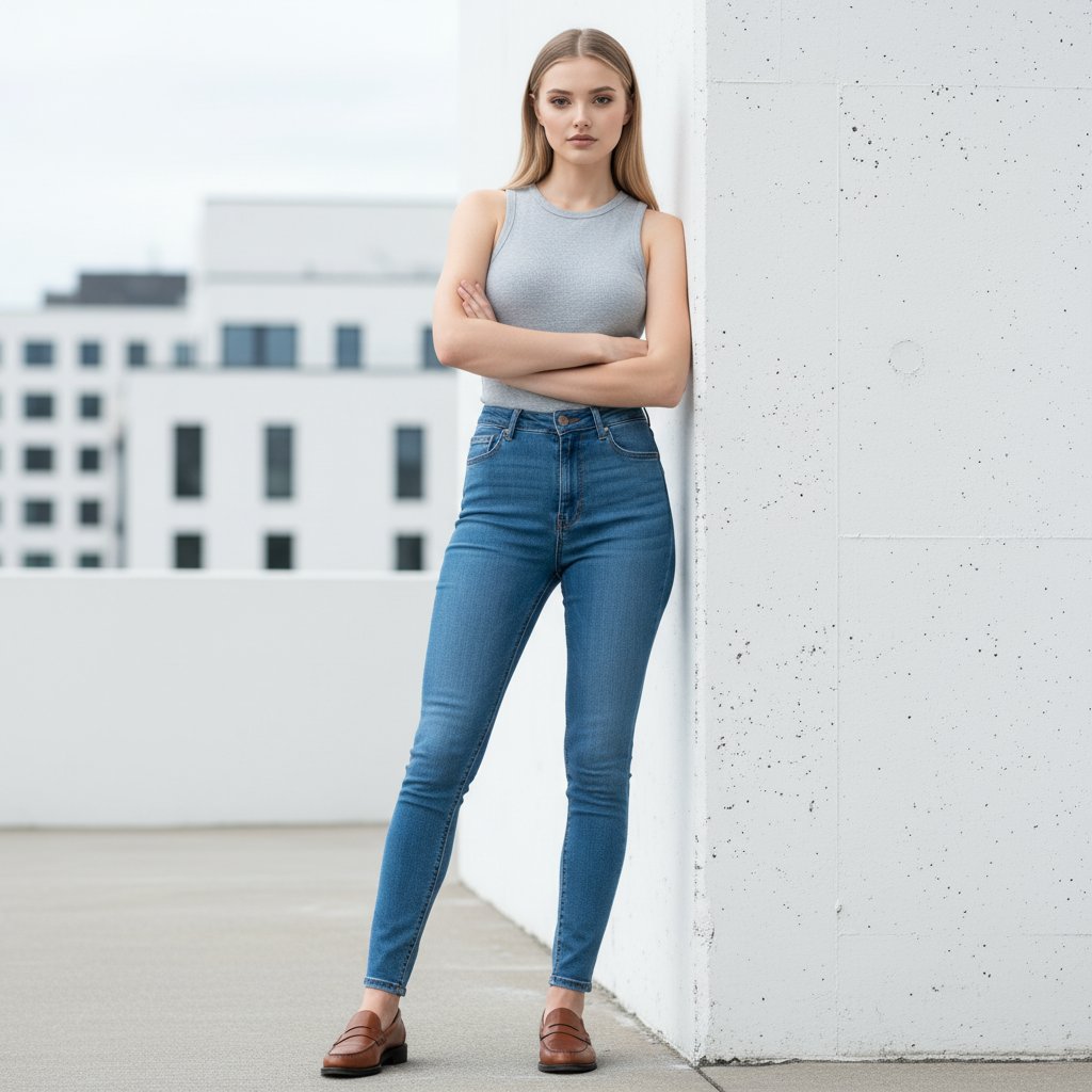 Девушка в синих джинсах с высокой посадкой и облегающем сером топе без рукавов. На ногах кожаные лоферы. Она стоит, прислонившись плечом к белой бетонной стене, руки скрещены на груди, взгляд прямой и уверенный. Фон - лаконичный городской пейзаж.