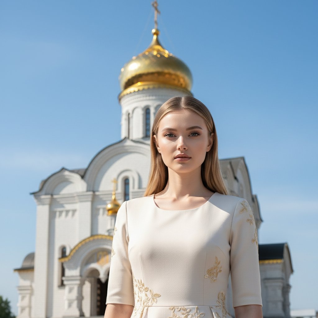Женский портрет на фоне часовни Николая Чудотворца в Новосибирске. Модель смотрит в объектив, ее наряд гармонирует с архитектурой. За ней видны золоченые детали купола и фасада часовни, построенной из оштукатуренного и побеленного кирпича. Фасады украшены закомарами в виде арок с острыми вершинами. Ясное голубое небо. Крупный план.