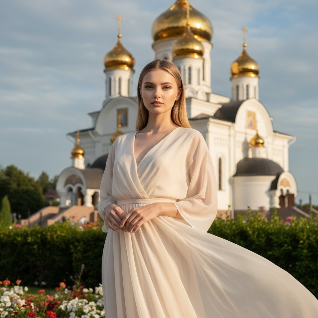 Женский портрет. Девушка в струящемся, воздушном наряде стоит перед часовней Святого Николая Чудотворца в Новосибирске. Мягкий солнечный свет освещает её лицо, выделяя черты. Архитектурные детали часовни и золотые купола создают живописный фон. Руки слегка расслаблены, взгляд направлен в объектив, излучая спокойствие и уверенность. Зеленые растения на переднем плане подчеркивают красоту её платья. Крупный план фокусируется на выражении лица и деталях образа.