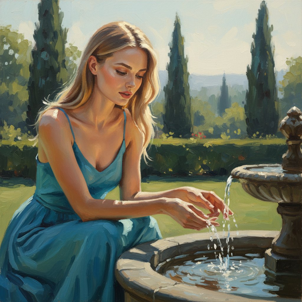 Дама в лазурном платье на тонких лямках расположилась у миниатюрного фонтана, её пальцы ласкают прохладную струйку. Свободные, экспрессивные мазки передают динамику водной глади и нежные солнечные блики на её чертах. На заднем плане раскинулся сад с величественными кипарисами, напоминающий стиль Тёрнера. Кадр крупным планом, подчеркивающий единение с природой. Стиль: масляная живопись.