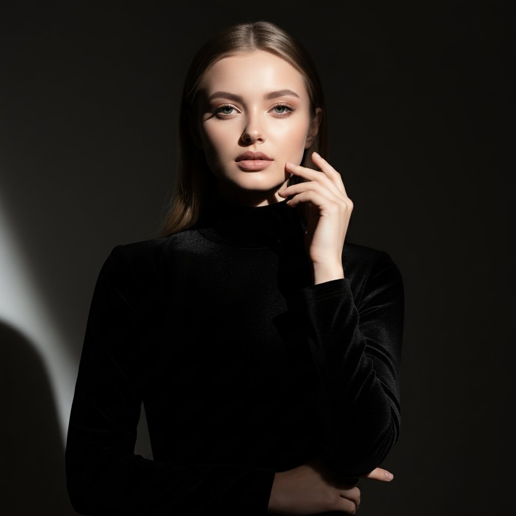 Портрет женщины в элегантном чёрном бархатном платье с высоким воротником, стоящей в полумраке. Резкий, диагональный световой луч, идущий слева, акцентирует контуры её лица и изящную кисть руки. Точечное освещение подчёркивает драматизм сцены, создавая кинематографическую атмосферу.