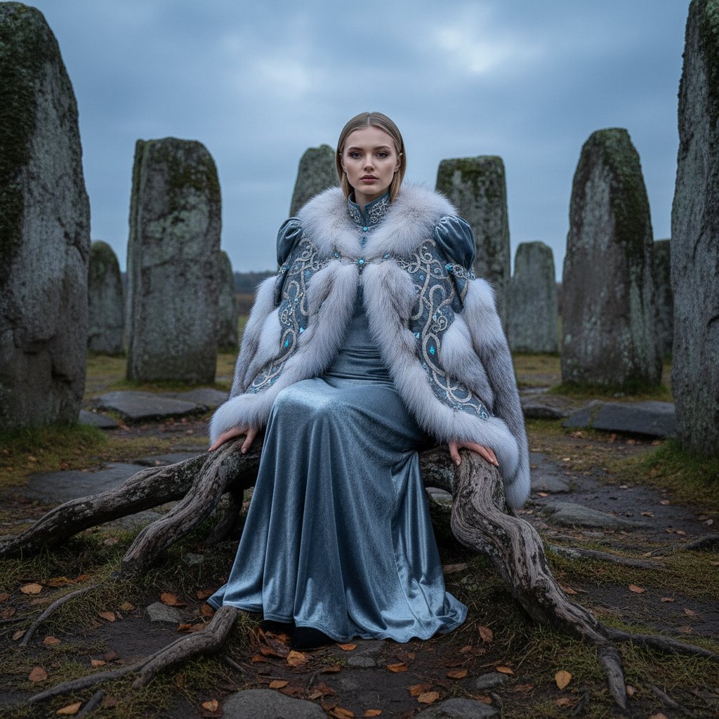 Женщина в длинном бархатном платье серебристо-синего оттенка, с высоким воротником и объемными плечами. На плечах — меховая накидка, украшенная вышивкой. Она находится внутри древнего каменного круга, сидит на большом корне дерева, наклонившись вперед и внимательно глядя в объектив.