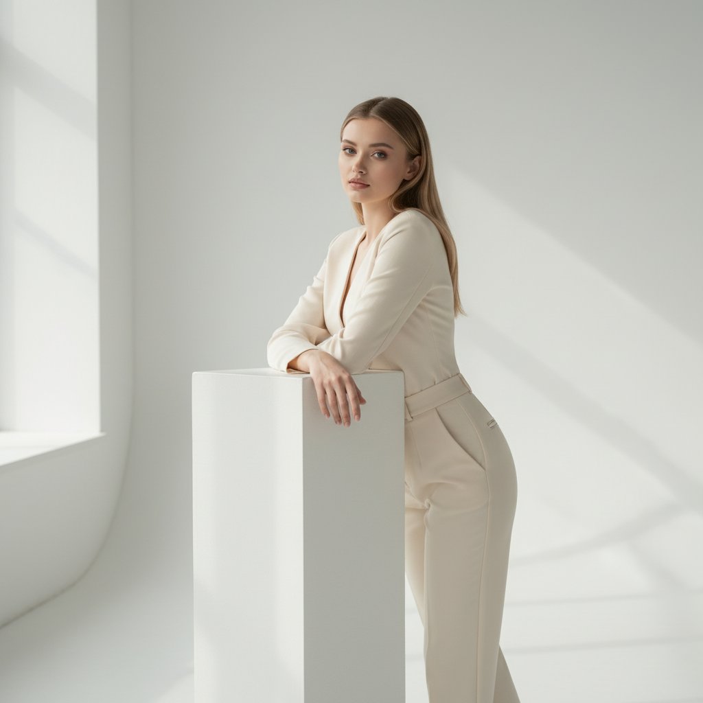 Женщина в облегающем молочно-белом пиджаке и кремовых брюках стоит вполоборота к зрителю. Она опирает локоть согнутой руки на высокую стойку и склоняет голову. Съемка в светлой минималистичной студии, освещенной мягким солнечным светом. Естественный макияж.