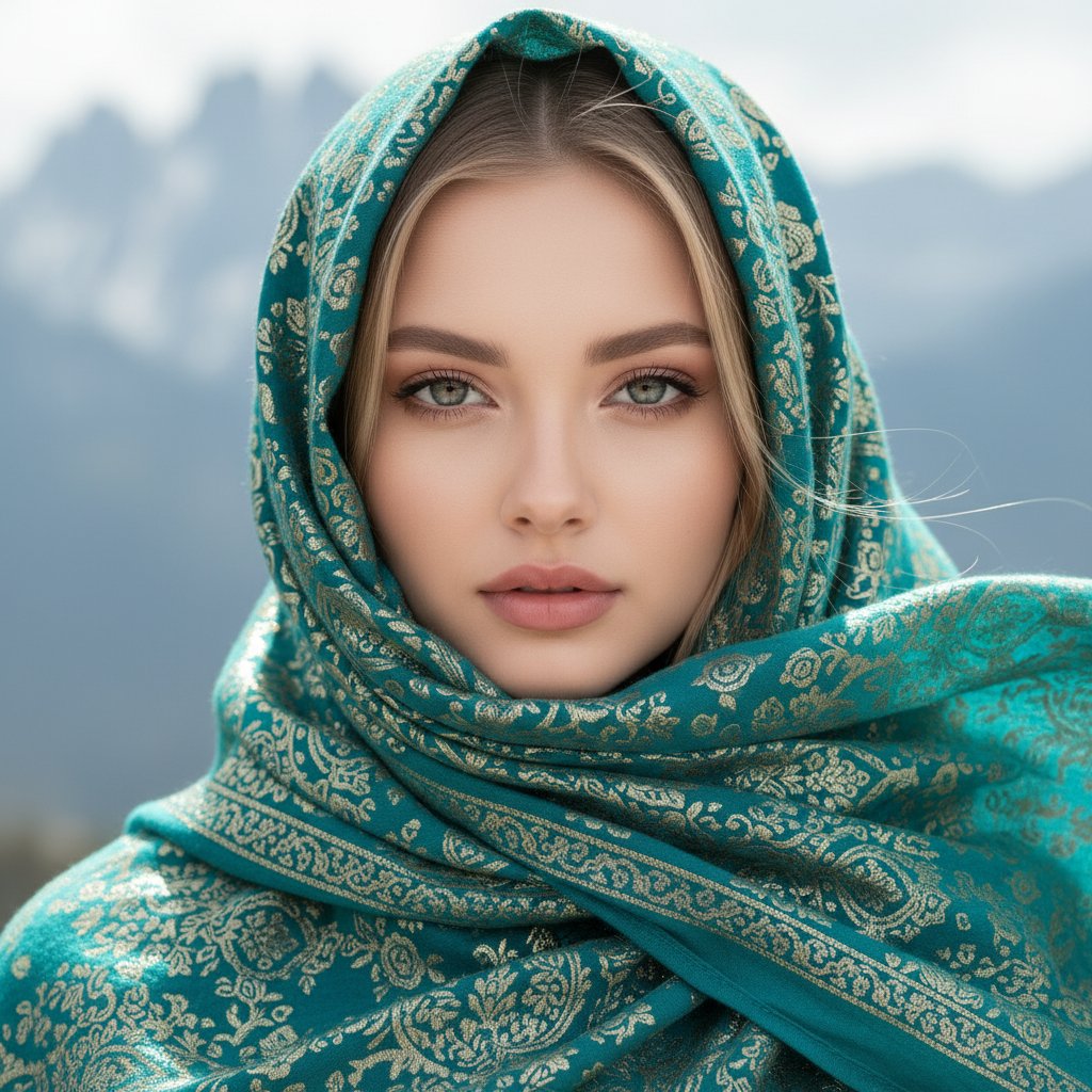 Портрет женщины, на голове бирюзовый платок с золотым узором, взгляд направлен в объектив, глаза выразительные и глубокие. Легкий ветерок колышет края платка. На заднем плане — размытые горные вершины. Снято крупным планом, акцентируя внимание на узоре платка и цвете глаз.
