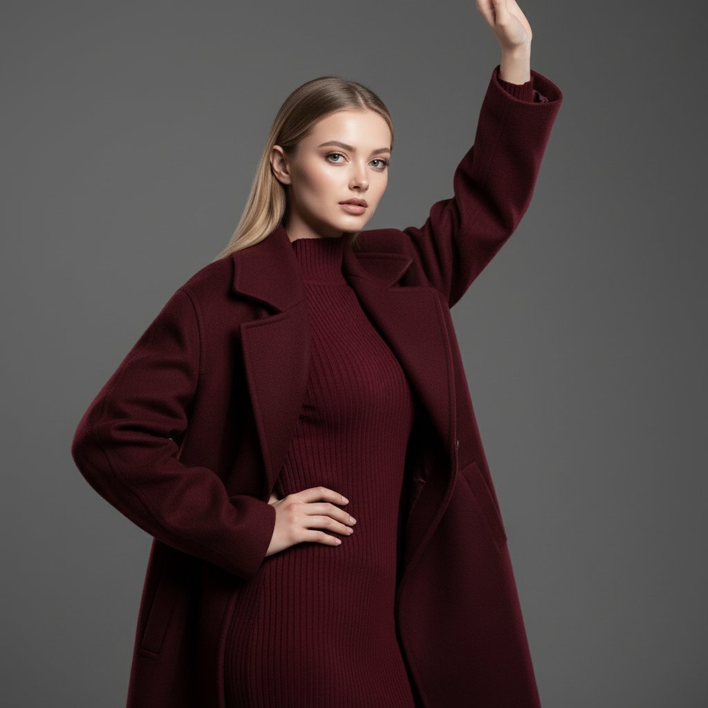 Молодая женщина в эффектном бордовом пальто оверсайз с выразительным асимметричным воротником, одета в облегающее трикотажное платье. Поза: полуоборот к зрителю, одна рука поднята над головой с раскрытой ладонью, тянущейся к свету, другая рука покоится на бедре. Взгляд направлен прямо в камеру. Фон — нейтральный антрацитовый.