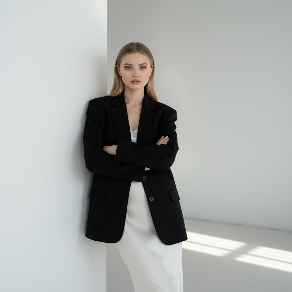 Женщина в черном пиджаке оверсайз, надетом поверх белого шелкового платья-комбинации, стоит, прислонившись спиной к белой стене. Руки скрещены на груди. Снято на среднем плане. Мягкий солнечный свет создает блики на полу и стене. Интерьер минималистичен, макияж естественный.