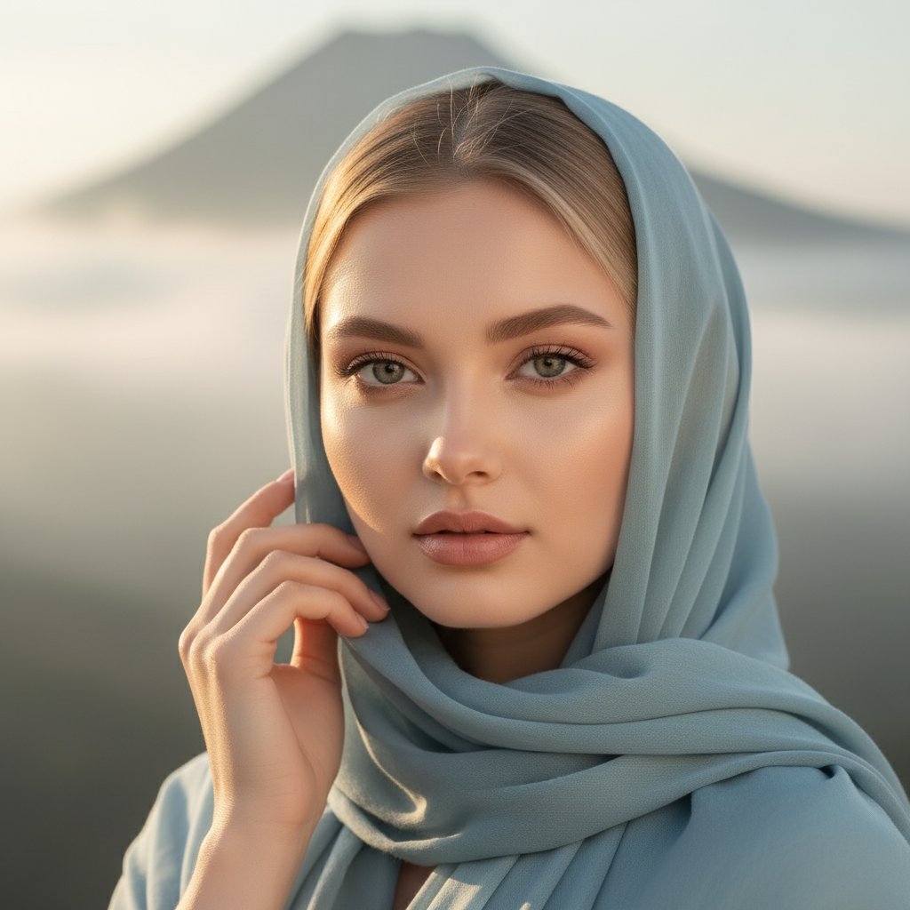 Портрет женщины в светло-голубом платке, мягко прикасающейся к ткани. Её лицо залито тёплым солнечным светом. На заднем плане — нечёткая горная вершина, над склонами клубится лёгкий туман. Крупный план, акцентирующий нежность и слияние образа с природой.