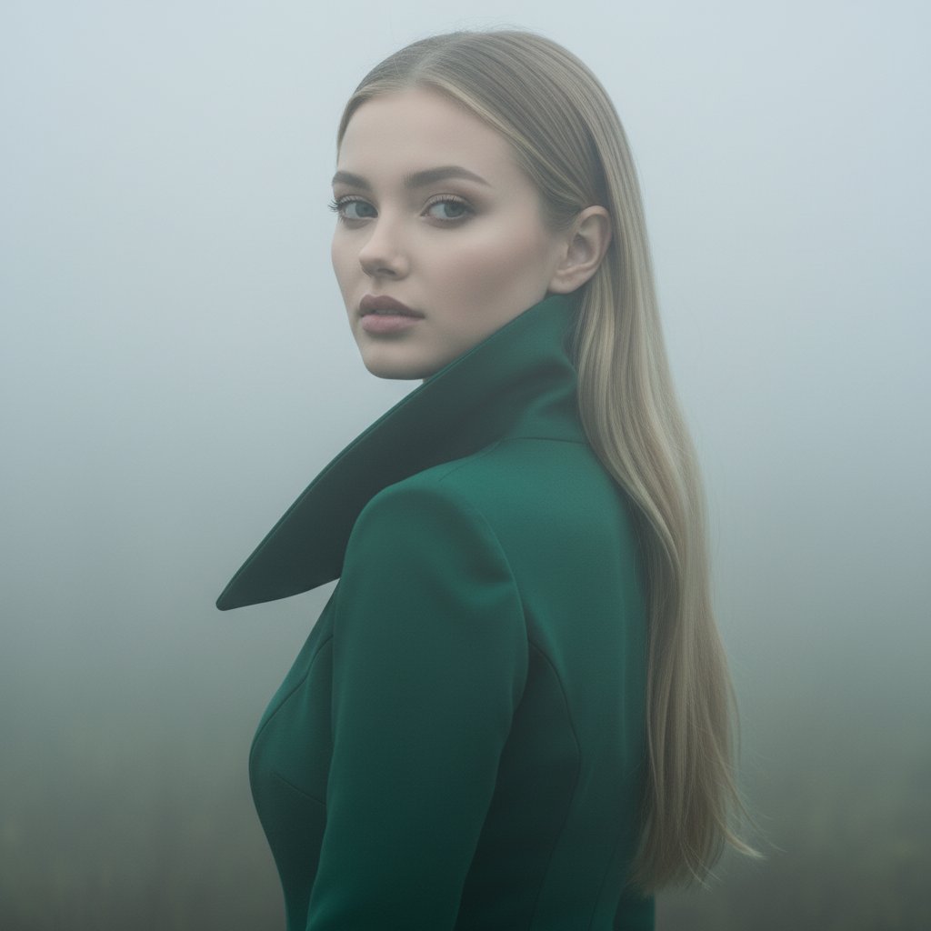 Портрет женщины в изумрудном платье с высоким воротником, идущей сквозь плотный туман. Лицо крупным планом, взгляд направлен через плечо. Туман смягчает черты лица, подчеркивая элегантность. Естественное освещение, акцентирующее глубину изумрудного цвета.