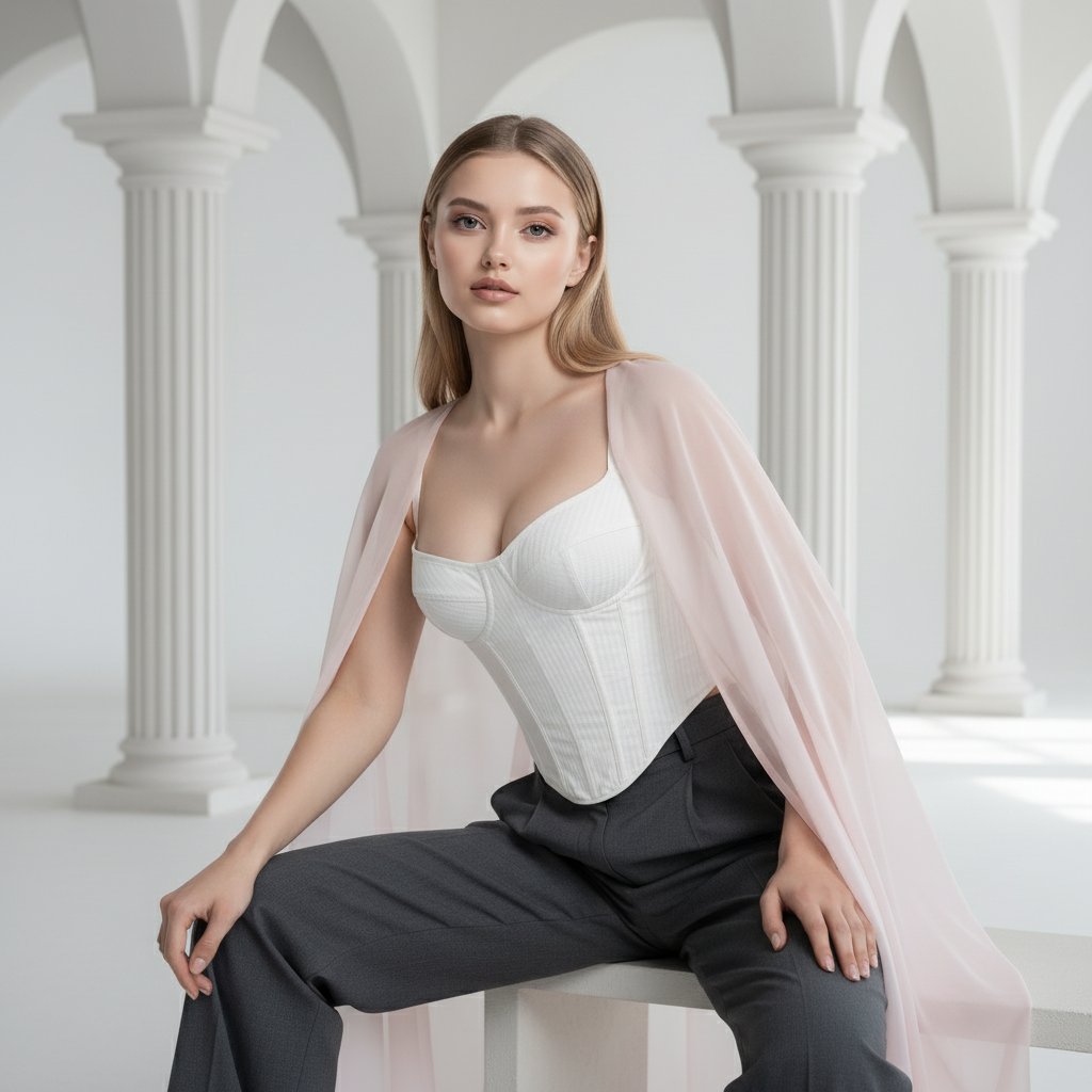 Светлая студия с арочными проемами и гипсовыми колоннами. Женщина в белом корсете с выразительной текстурой, классических серых брюках и полупрозрачной накидке пудрового оттенка. Сидит вполоборота на низкой скамье, опираясь локтем на колено. Крупный план, взгляд уверенный, направлен в камеру. Мягкое, рассеянное освещение.