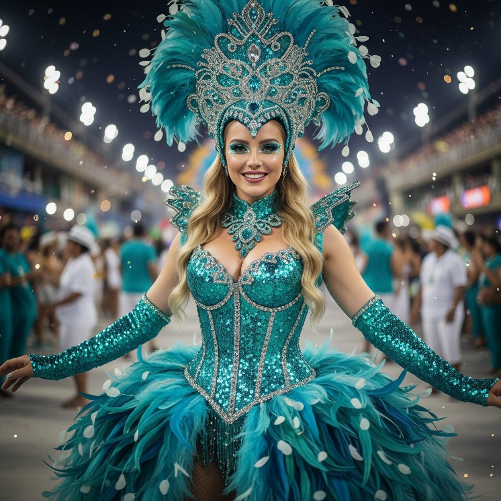 Женский портрет в ярком карнавальном наряде оттенка морской волны. Верх костюма, усыпанный блестящими пайетками, и пышная юбка из длинных перьев. На голове — внушительный головной убор, украшенный бисером. Образ дополняют сверкающие длинные перчатки. Снято на среднем плане, модель смотрит в объектив. Задний план — пестрые огни и атмосфера праздника Рио-де-Жанейро.