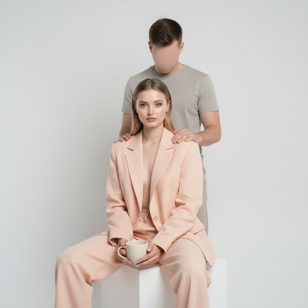 Женщина в свободном пастельном костюме сидит на низком кубе на белой циклораме. В руках она держит простую керамическую чашку. Мужчина стоит позади, положив руку ей на плечо, его лицо скрыто. Она уверенно смотрит в камеру. Стиль минимализм, средний план.