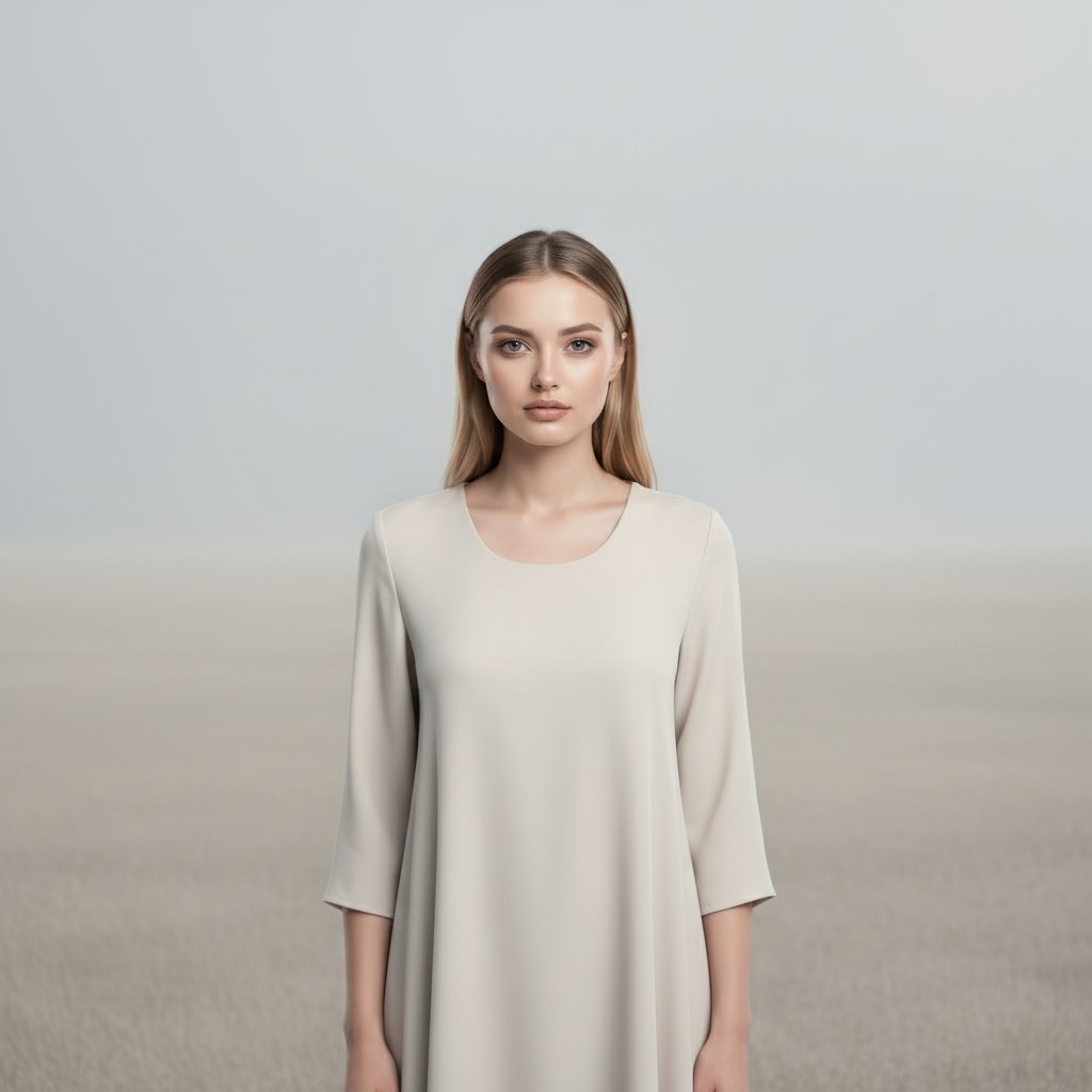 Женщина в минималистичном платье светло-серого оттенка стоит в центре безлюдного поля, её взгляд устремлен прямо в объектив. Окружающее пространство лишено каких-либо деталей, текстур или растительности, оно заполнено лишь мягкими переходами серого и бежевого. Снято крупным планом.