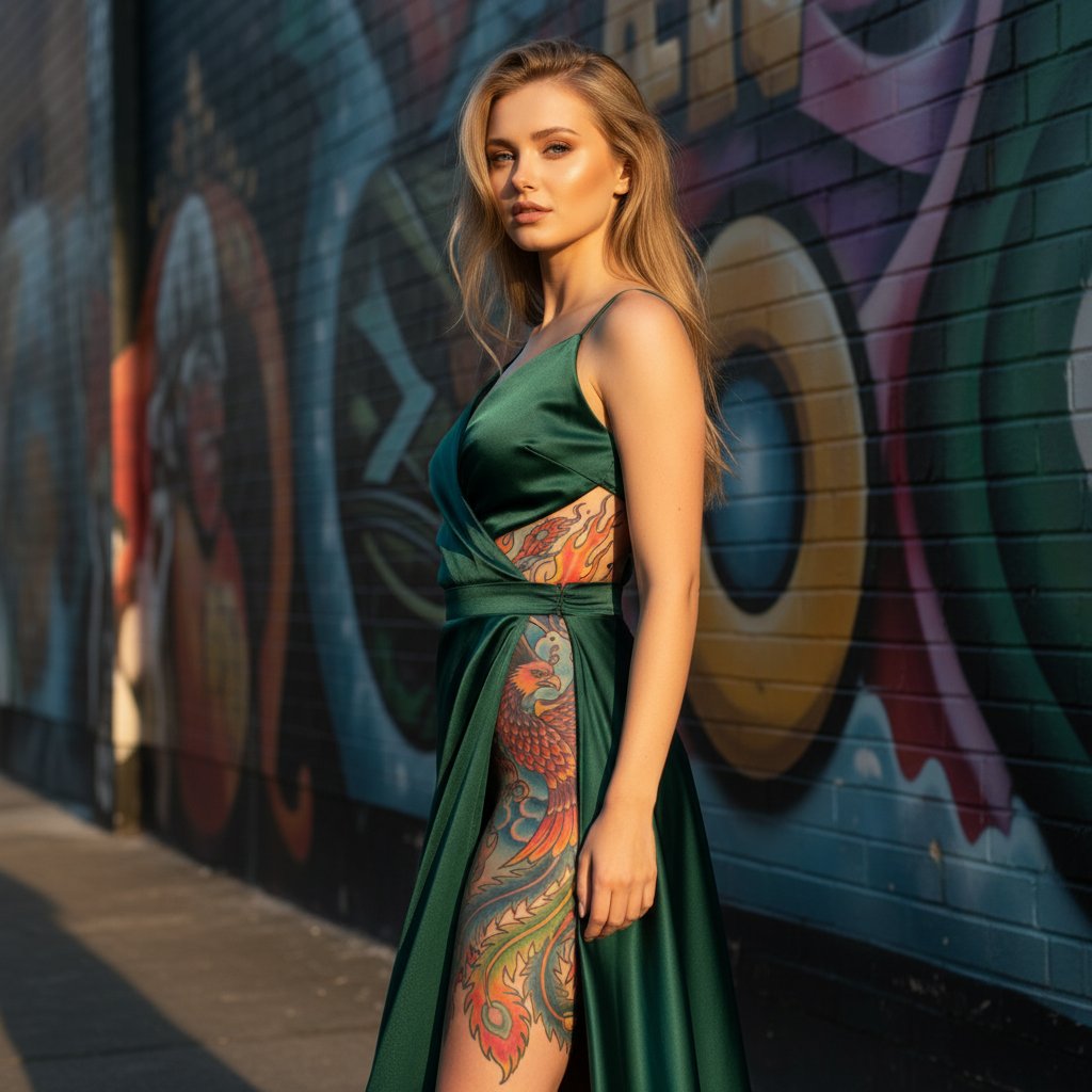 Фотография женщины в темно-изумрудном атласном наряде. Она стоит у стены, разрисованной уличным искусством. Бок слегка развернут, демонстрируя татуировку феникса, переходящую с области ребер на бедро. Солнечный свет подчеркивает яркость рисунка.