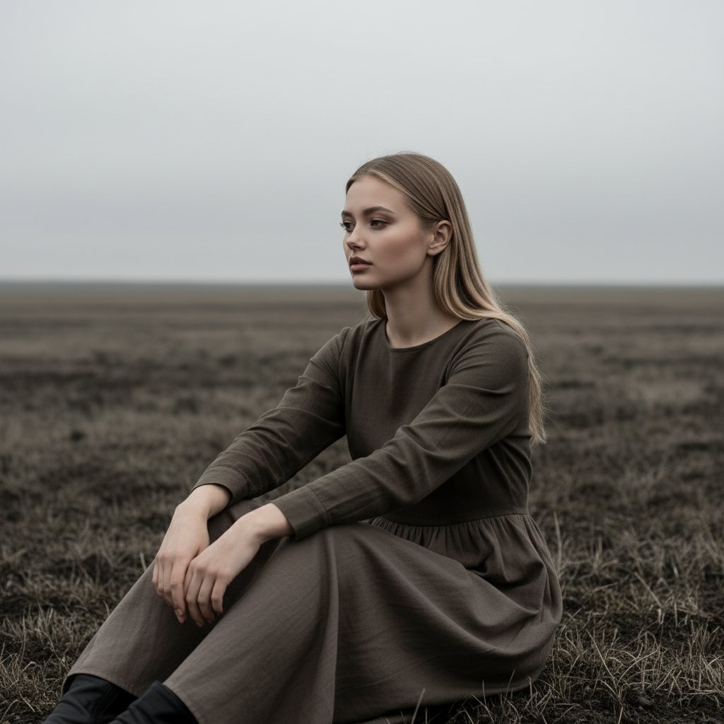 Портрет женщины в платье цвета земли, сидящей посреди бескрайнего поля. Она погружена в свои мысли, её руки спокойно лежат. Пустота вокруг, окрашенная в холодные серые и коричневые тона, формирует минималистичную, северную атмосферу. Снято крупным планом.