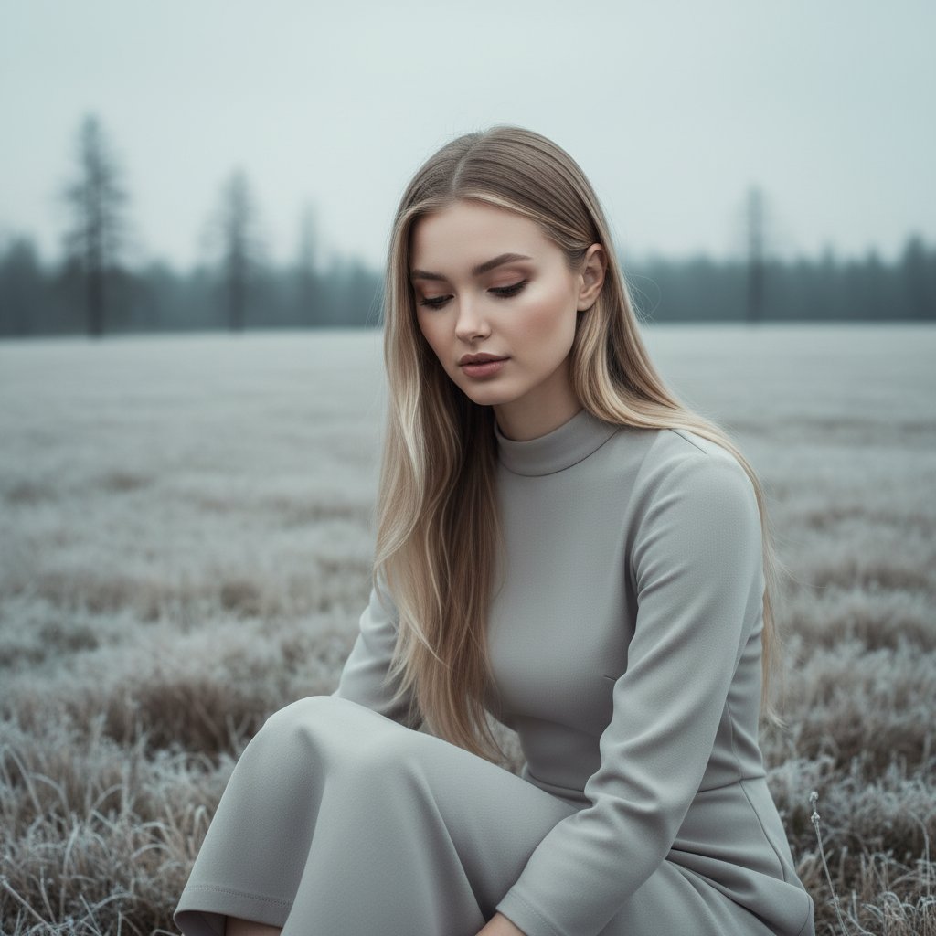 Женский портрет крупным планом: девушка в простом серо-бежевом платье сидит в поле. Взгляд опущен вниз. Минималистичный фон в холодных тонах создает атмосферу северного спокойствия и простоты.