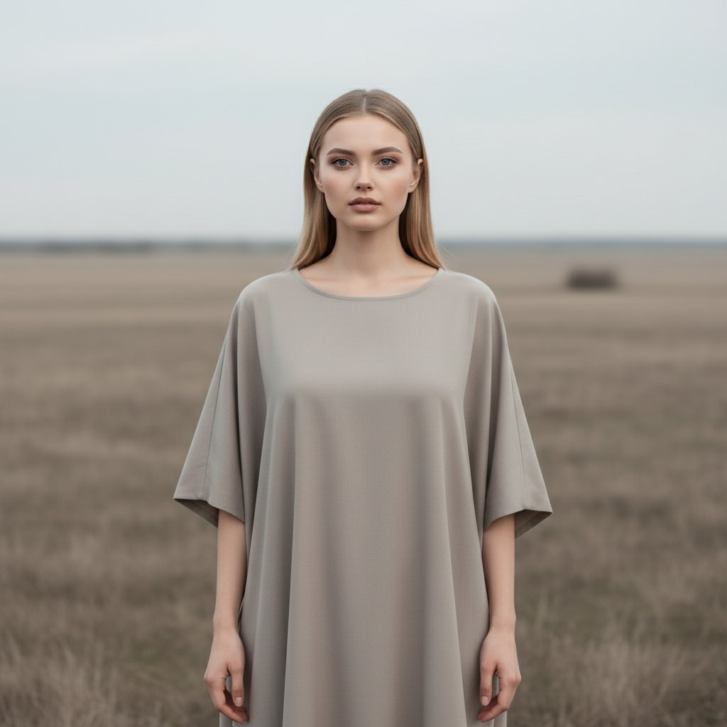Женщина в просторном серо-бежевом платье стоит посреди пустого поля, взгляд устремлен вдаль. Руки расслабленно свисают по бокам. Минималистичный пейзаж подчеркивает умиротворение и отстраненность. Крупный план.