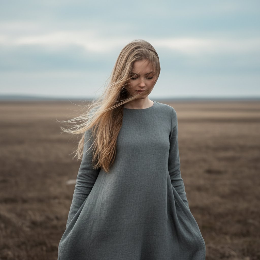 Крупный план женщины, стоящей посреди бескрайнего поля. На ней длинное платье из грубого льна насыщенного серого цвета. Взгляд направлен вниз, волосы развеваются на ветру. Минималистичный фон с оттенками земли и неба, создающий атмосферу северного спокойствия.