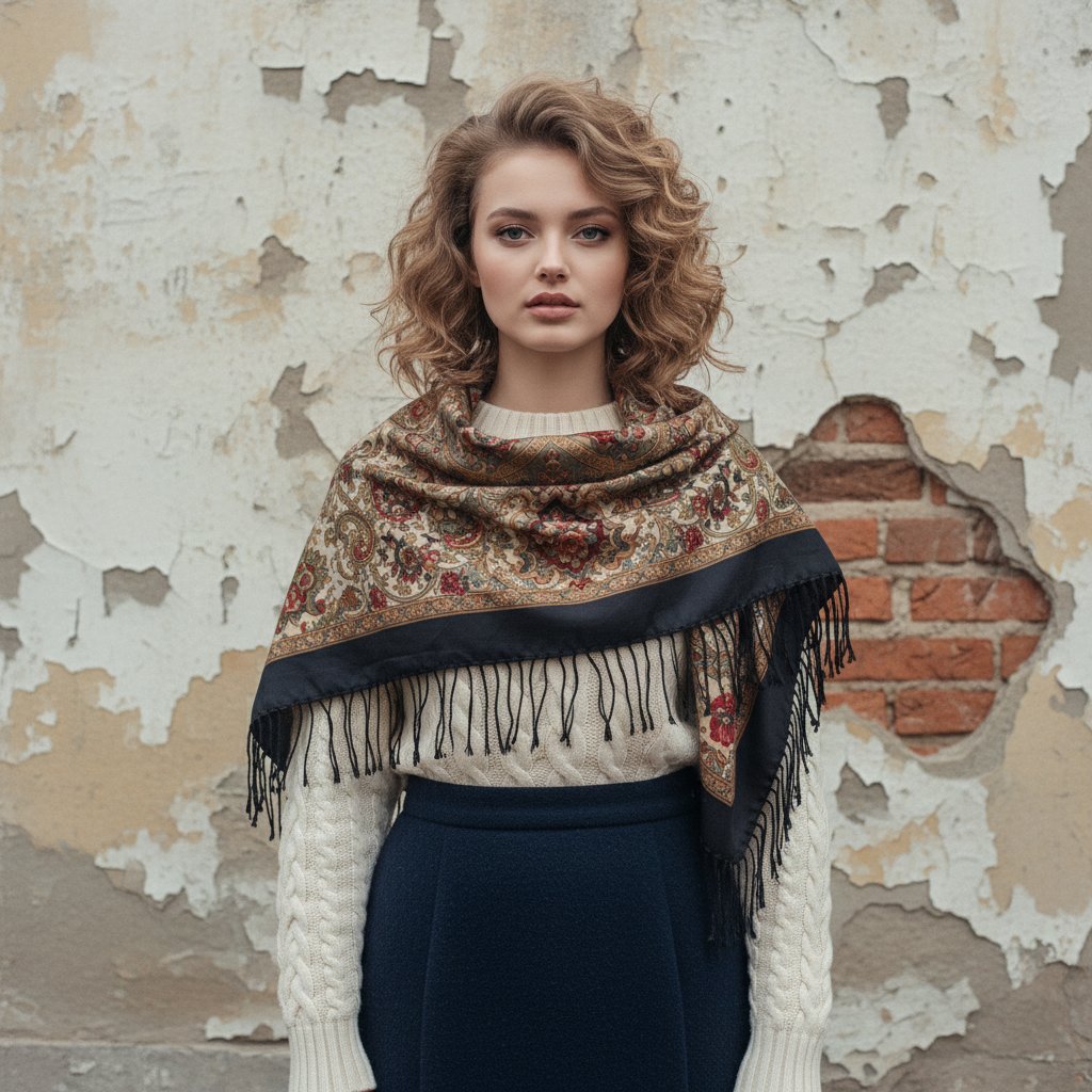 Дама в вязаном свитере крупной вязки с узором и юбке из плотного материала, накинутый на плечи винтажный шарф, прическа волнами в духе 80-х. Стоит перед стеной типового здания с облупившейся штукатуркой. Средний план, взгляд направлен в объектив. Атмосфера пленочной фотографии.