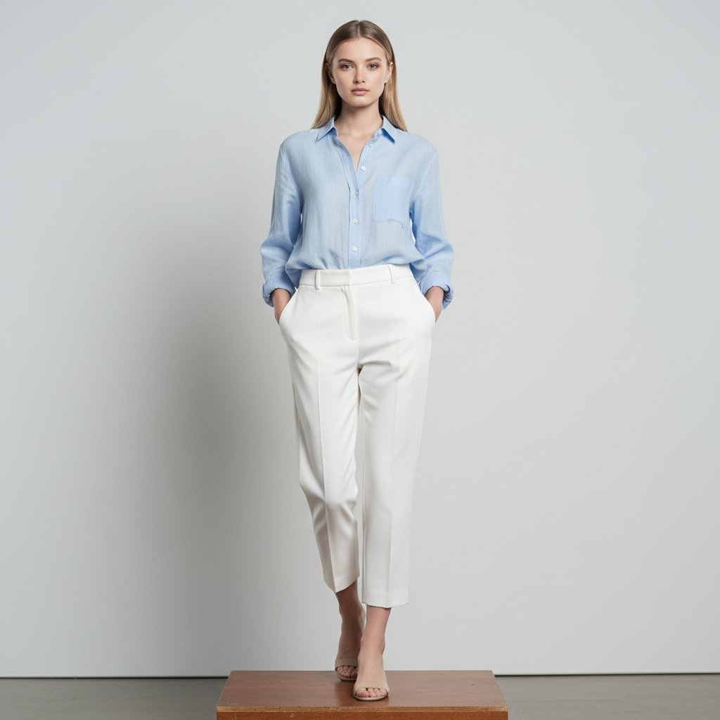 Модель демонстрирует элегантный повседневный образ от Ralph Lauren, стоя на подиуме. На ней свободная голубая рубашка, заправленная в укороченные белые брюки со стрелками. Фон нейтральный, освещение мягкое, взгляд направлен в камеру, средний план.