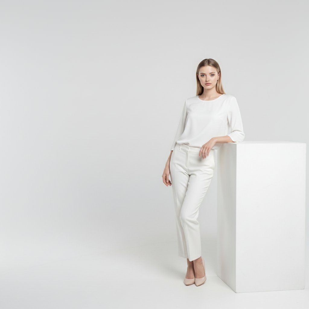 Женщина с аккуратно уложенными волосами, одетая в простую белую блузу, стоит, прислонившись к белому кубу одной рукой. Снято на среднем плане, взгляд направлен прямо в объектив. Фон — пустая циклорама, освещенная мягким студийным светом, подчеркивающим минималистичную атмосферу.
